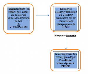 - pour les formations de M1, dont le nombre d’étudiants est contingenté, les candidats doivent déposer un dossier de VEEPAP/admission, qui sera utilisé par la commission pédagogique compétente pour juger de la validation et de l’admission. S’ils reçoivent une réponse favorable de la commission de validation des cursus, ils pourront ensuite compléter leur inscription à l’ESPE.